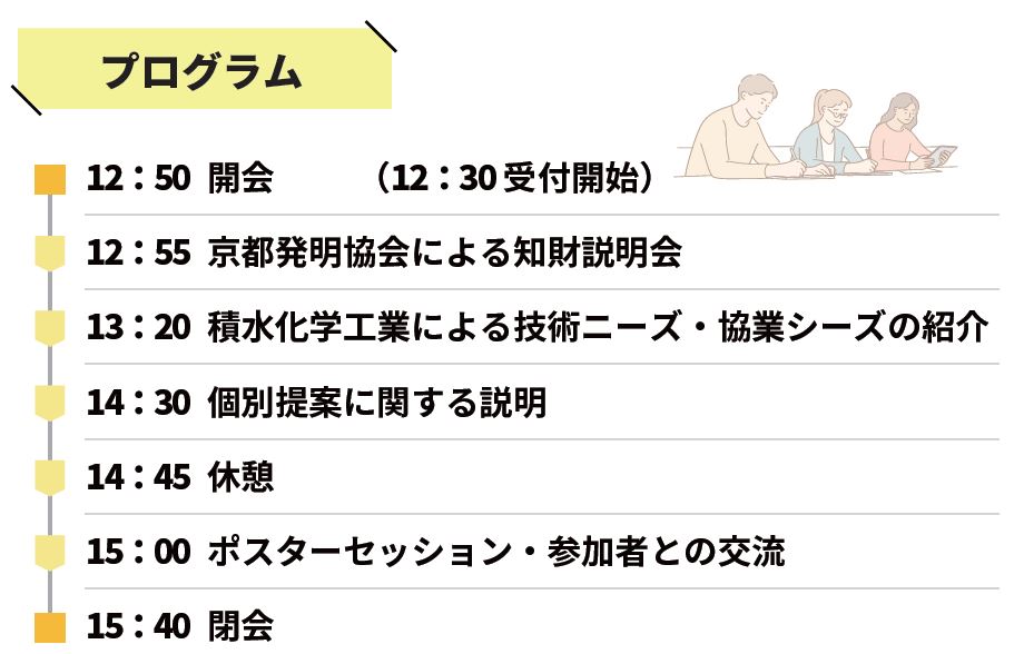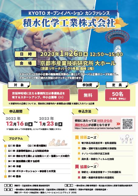 今回のカンファレンスでは、一般社団法人京都発明協会による知財説明会の後、高機能材料を開発・提供する積水化学工業株式会社の技術ニーズと協業シーズを紹介し、企業連携に向けた技術マッチングを支援します。