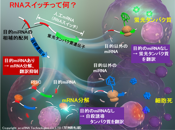 「RNAスイッチ™」とは、マイクロRNA(miRNA)を認識する配列と蛍光タンパク質や自殺遺伝子などのマーカー遺伝子を含む人工的に作製したメッセンジャーRNA(mRNA)を指しています。miRNAは、細胞内に存在し、様々な生命現象に関わっていると言われており、その数は約2,700種類に上ると報告されています。RNAスイッチ™は細胞内に導入された後、目的のmiRNAが存在すれば分解されますが、存在しなければタンパク質が発現し、蛍光タンパク質が光るあるいは細胞死するので細胞の識別・選別が可能になります。
