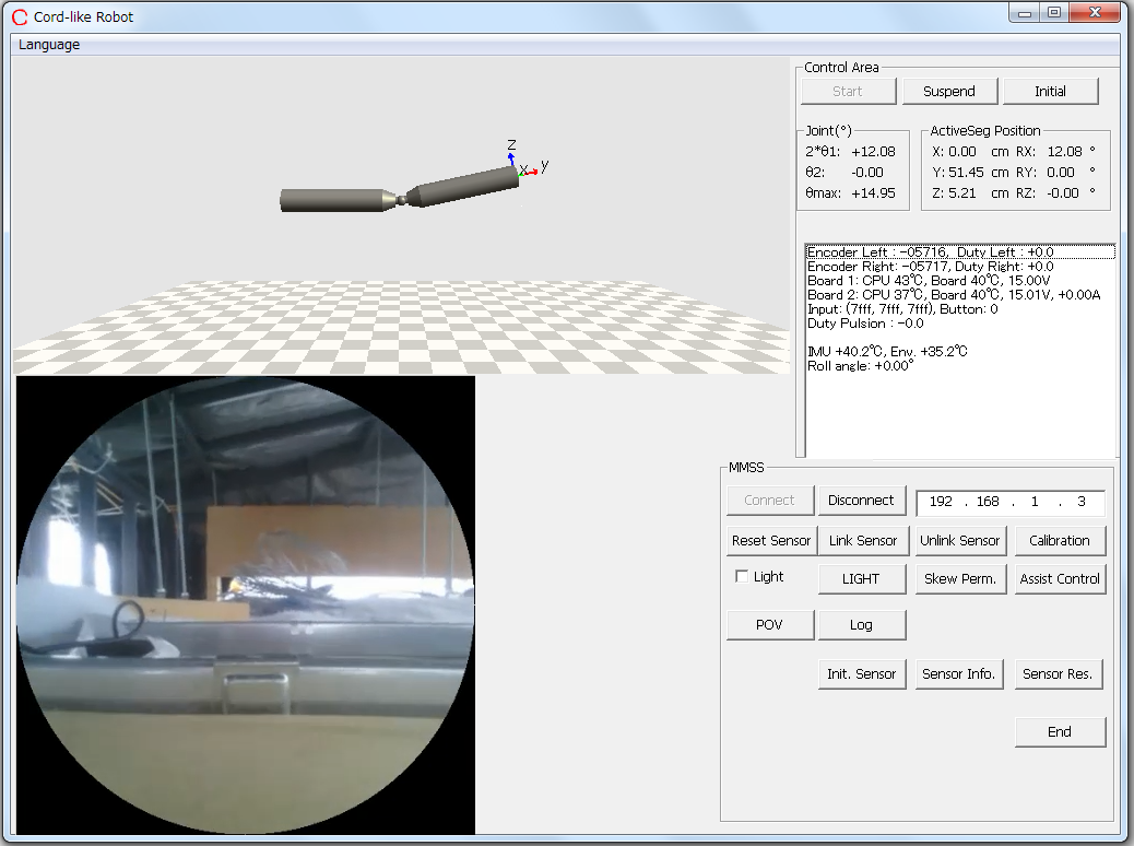 STC3) 単一汎用PC操作インタフェース (Simple PC & ControlPad Operation Interface; P2IF)・マルチモーダルセンシング (Multimodal Sensing; MMS):システムの全動作を1セットの汎用PC・制御パッドによる遠隔操作インタフェースを提供する。また、映像/音声会話/温度/ガス等マルチモーダルな探索情報、IMS・LPS/LED機能に必要な情報、遠隔操作に必要な情報、及びシステム動作状態の監視・保護・記録に必要な情報の検出・集約・省配線伝送・操作インタフェース上表示などの機能を提供する。