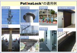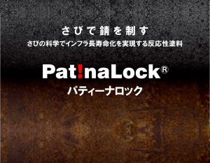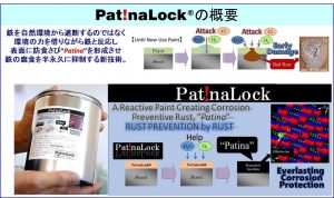 - これまでの防食塗料の概念とは異なる新技術。鉄は地球の中で酸化物(鉄鉱石)として眠っているので常に鉄鉱石に(すなわち地球に)還ろうとする。このことが錆びるということであり、自然の流れである。反応性塗料Pat!naLock®は鉄や腐食環境とむしろ反応し、鉄表面にさびを主体とした防食性の高い酸化物膜をつくり、自然と共生することで鉄を自然の状態に落ち着かせ、腐食を抑制する。