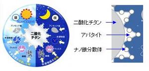 ①二酸化チタン/光触媒作用で細菌・ウイルスを不活化させると共に、臭い原因やVOCを化学分解し、カビ菌などの発生を抑制する。②アパタイト/二酸化チタンの表面に、多孔質で吸着性の高いアパタイトの結晶を析出。アパタイトは細菌・ウイルス他を吸着させると共に、塗装下地基材の保護の役目もある。