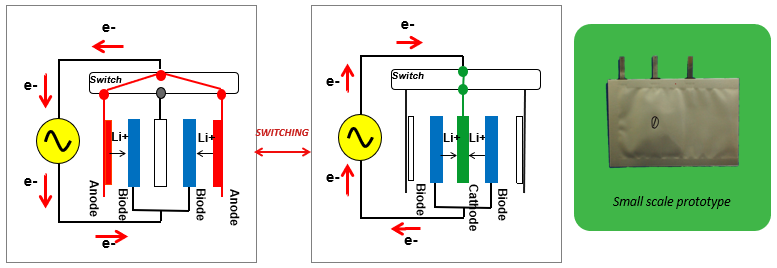 - 既存の直流充放電装置を利用して交流電池の充放電が可能な蓄電技術を開発し、安全で大容量の交流電池をEVや航空宇宙等をはじめとした蓄電市場に提供する。