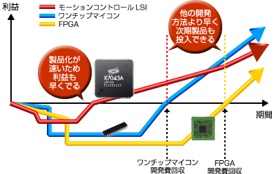 - モーションコントロールLSIなら ■短い期間で開発できる。 ■FPGAやワンチップマイコンが評価・検証をしている時には、すでに製品を リリースできている。 ■開発資金の回収、利益化が迅速にできる。 ■開発コストが全体的に抑えられるため、リスクも少ない。