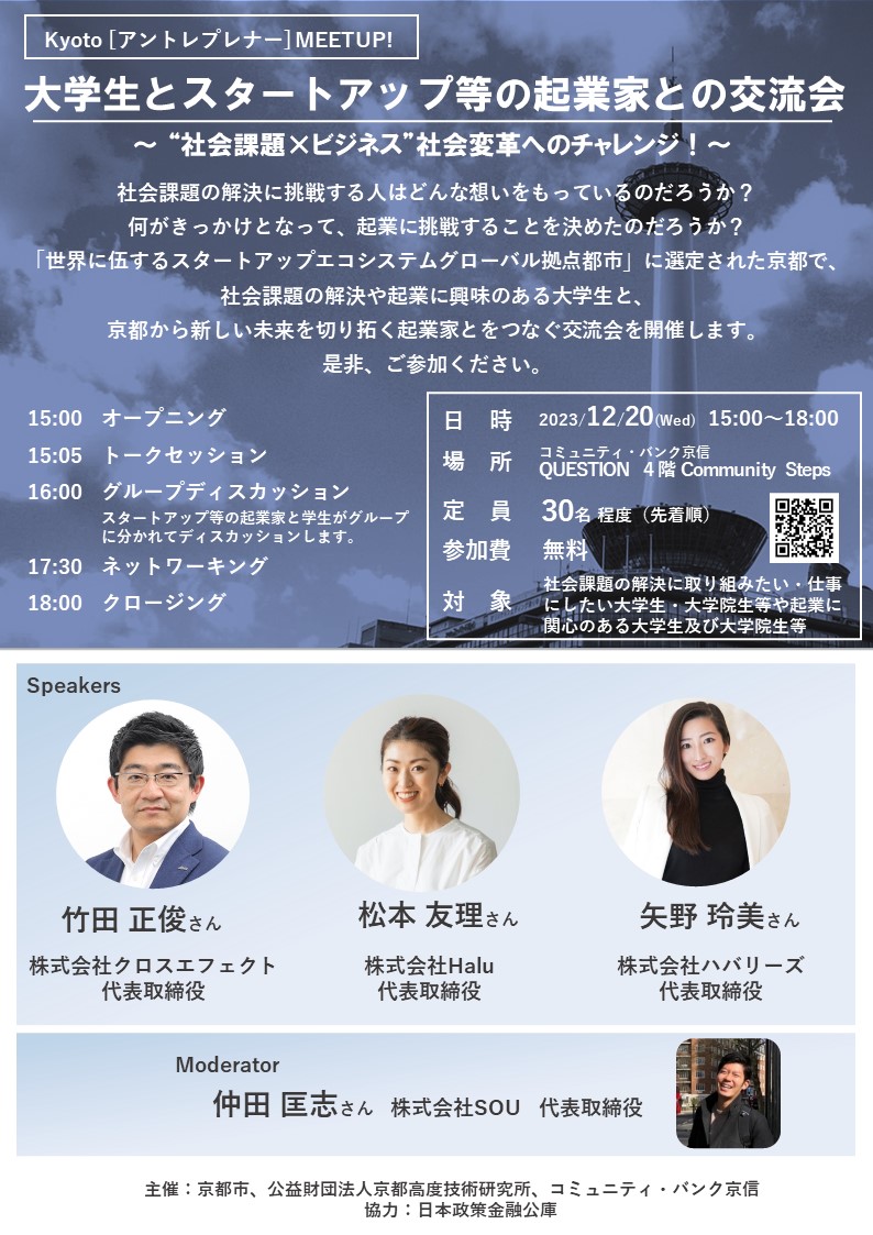 京都市、(公財)京都高度技術研究所及びコミュニティ・バンク京信では、社会課題の解決に取り組みたい・仕事にしたい大学生や起業に関心のある大学生等を対象に、ビジネスとして社会課題の解決に挑戦されている起業家との交流会を開催しますので、お知らせします。